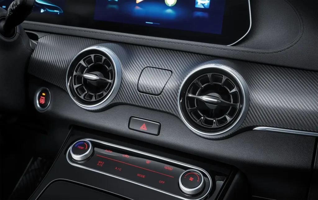 The air conditioning vents are equipped with a panel made of synthetic carbon fiber which makes it completely sporty, AUX input